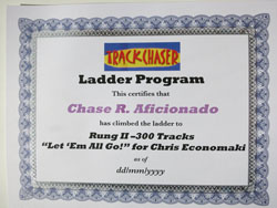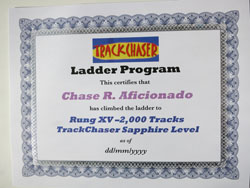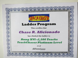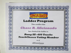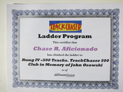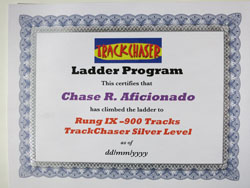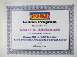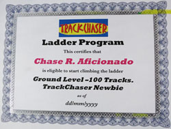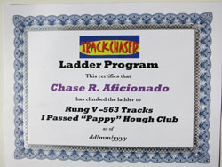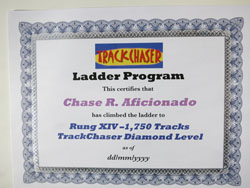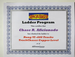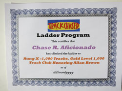 The TrackChaser Fan Ladder Program is patterned after the Martial Arts belt system. It is an introspective exercise in goal setting and attainment, where an individual TrackChaser Fan can challenge themselves to climb to the next rung on the ladder. There is no competition involved with other TrackChasers as with the NSD Awards Program. There is no limit to how many individuals can rest on any single rung. Certificates of Achievement are available upon request. Last updated March, 2019 |